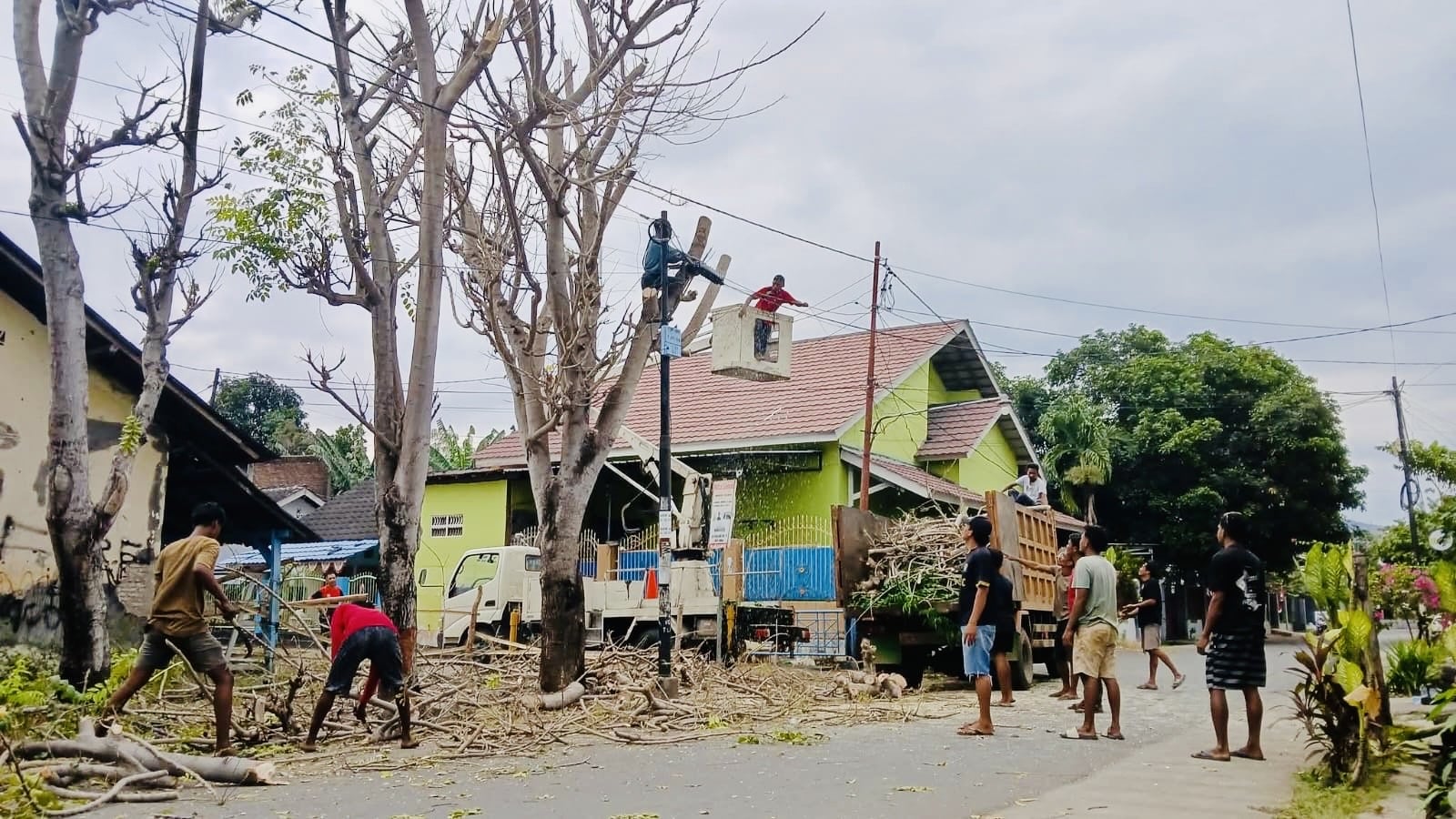 Petugas DLH bersama Dinas Damkar dan Penyelamatan saat pemangkasan pohon dan pembersihan. Foto: Ist