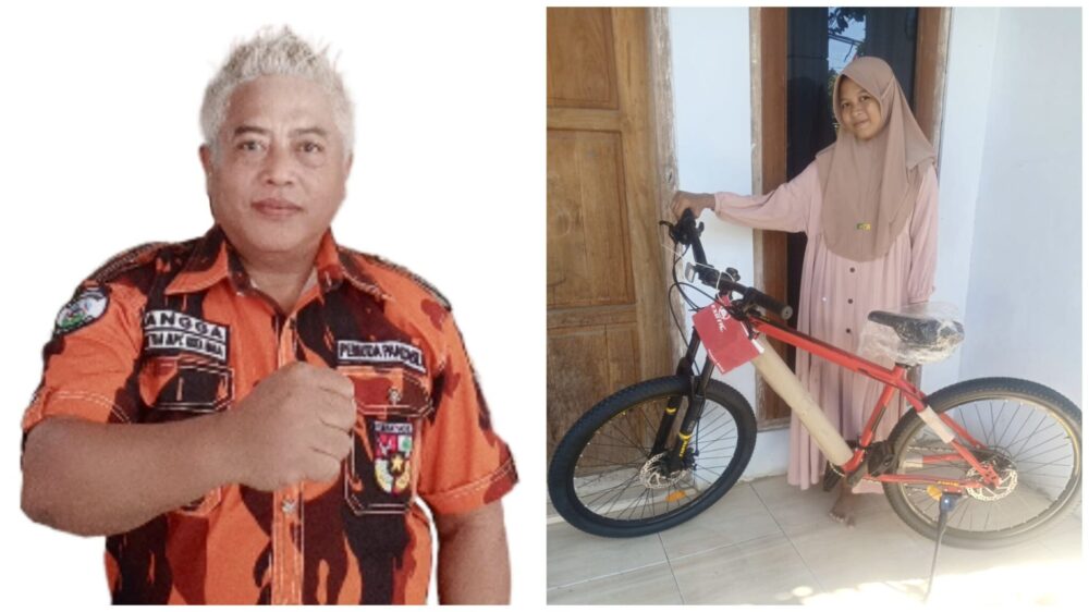 Kota Bima, Kahaba.- Ketua Pemuda Pancasila (PP) Kota Bima Muhammad Haris memberikan kejutan berupa hadiah sepeda untuk Putri Shaqila Fakhirah, Qoriah cilik yang meraih Juara Terbaik I pada cabang Tilawah Golongan Anak-Anak pada MTQ Tingkat Kecamatan Mpunda, yang baru saja berakhir.