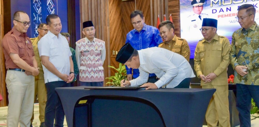 Bupati Bima Ady Mahyudi saat Penandatanganan Komitmen Bersama Percepatan Penerapan Sistem Merit dan Pengembangan Manajemen Talenta bagi seluruh Pemerintah Daerah se-NTB. Foto: Ist
