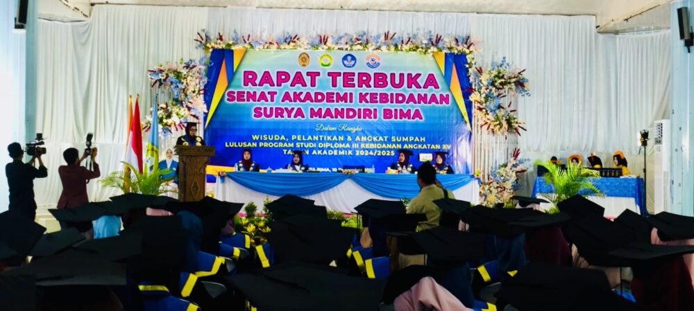 Kota Bima, Kahaba.- Akademi Kebidanan (Akbid) Surya Mandiri Bima resmi mengukuhkan 63 wisudawati sebagai Ahli Madya Kebidanan pada Rapat Terbuka Senat dalam rangka wisuda, pelantikan, dan angkat sumpah lulusan DIII Kebidanan angkatan ke-XV tahun akademik 2024–2025, di Gedung Convention Hall, Rabu 10 Desember 2025.