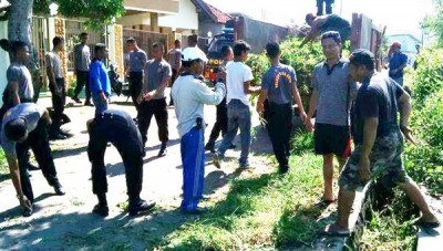 Kota Bima, Kahaba.- Personil Kepolisian Kota Bima bersama dengan Dinas Kebersihan, Pertamanan dan Pemakaman (DKPP) serta Wakil Ketua DPRD Kota Bima, Jumat (13/3) menggelar gotong royong di Kelurahan Santi.