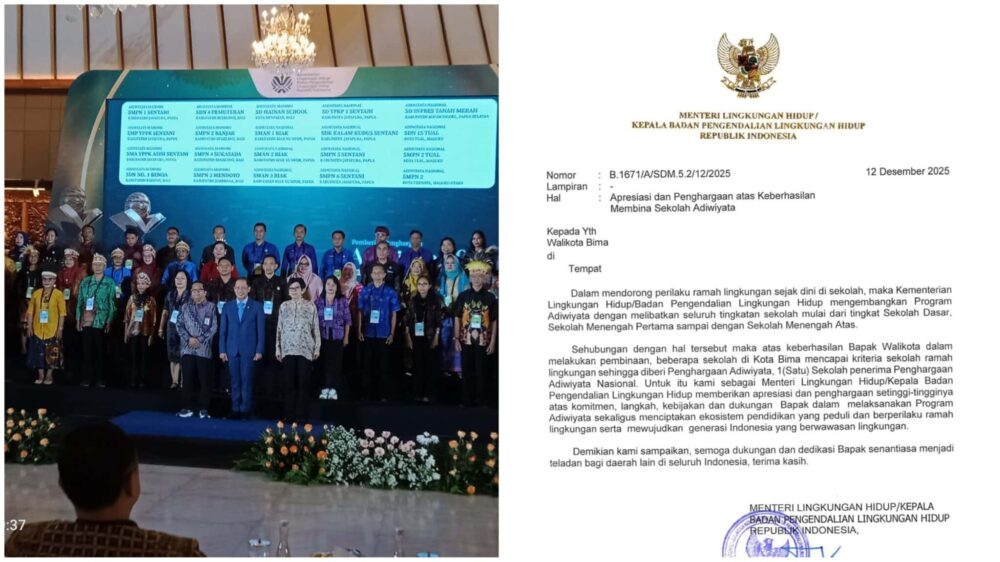 Tak hanya itu, Wali Kota Bima, H A Rahman H Abidin juga menerima apresiasi dan penghargaan langsung dari Menteri Lingkungan Hidup/Kepala Badan Pengendalian Lingkungan Hidup RI. Apresiasi tersebut tertuang dalam surat Nomor B.1671/A/SDM.5.2/12/2025 tertanggal 12 Desember 2025.