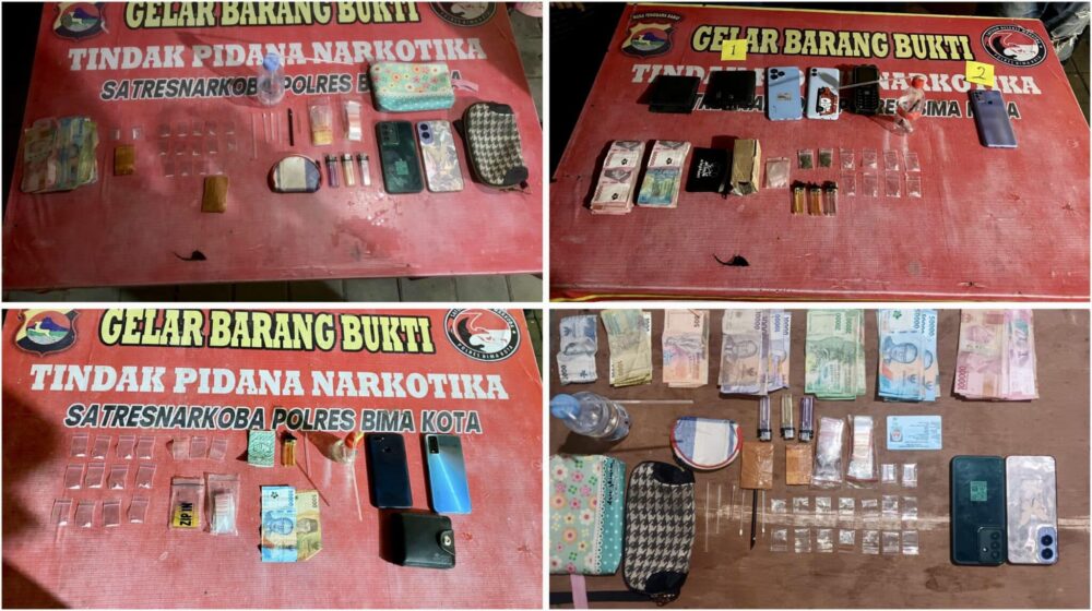 Pengungkapan pertama dilakukan sekitar pukul 12.30 Wita di Lingkungan Benteng, Kelurahan Melayu, Kecamatan Asakota. Tiga terduga pelaku diamankan bersama barang bukti delapan paket sabu seberat 1,76 gram, dua paket ganja seberat 1,58 gram, alat hisap, beberapa unit handphone, serta uang tunai sebesar Rp14.295.000.