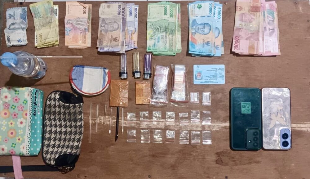 Selain itu, turut disita sejumlah barang bukti lain berupa plastik klip kosong, korek api, kaca, lima sendok pipet, alat hisap (bong), dua unit telepon genggam, dua dompet, satu KTP, serta uang tunai sebesar Rp1.338.000 yang diduga hasil transaksi narkoba.